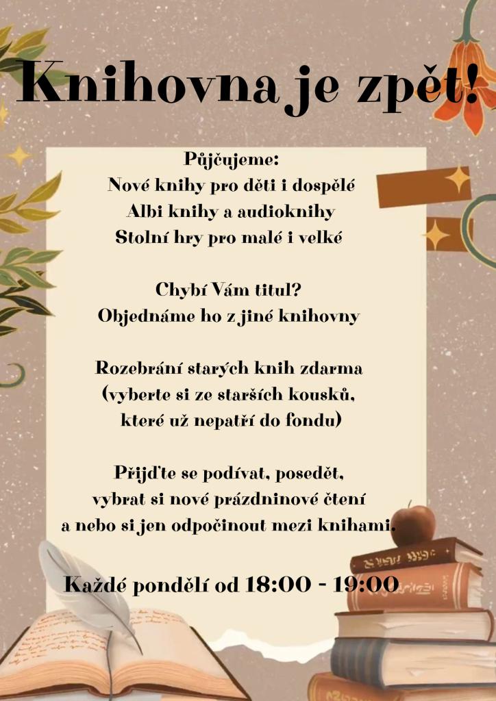 Naše knihovna nabízí široký výběr nových knih pro děti i dospělé, které si můžete půjčit. Každé pondělí od 18:00 do 19:00 máte příležitost nejen si vybrat nové tituly, ale také si posedět a odpočinout si mezi knihami. Pokud vám chybí nějaký konkrétní titul, rádi ho pro vás objednáme z jiné knihovny. Nezapomeňte také na možnost rozebrání starých knih zdarma, kde si můžete vybrat z kousků, které již nepatří do fondu.